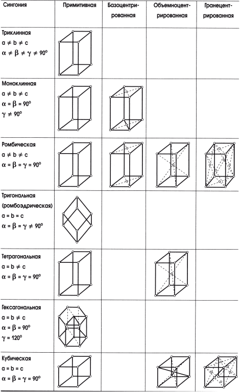 По симметрии формы элементарные ячейки, и соответственно кристаллические решетки, разделены на три категории: низшую, среднюю и высшую. Низшая категория содержит три сингонии: триклинную, моноклинную и ромбическую. Средняя – также три сингонии: тригональную, тетрагональную и гексагональную. Высшая категория включает одну сингонию – кубическую (табл. 3.1).