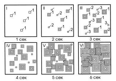 На рис. 3.2 приведен пример кристаллизации в схематическом виде. Скорость зарождения составляет 4 зародыша в секунду, скорость роста кристалла – 1 мм в секунду. За первую секунду в объеме образовалось 4 кристаллика (обозначены цифрой 1). За вторую еще 4 (обозначены цифрой 2), а ранее возникшие кристаллы выросли на 1 мм с каждой стороны. В следующую секунду образовалось еще 4 кристалла (обозначены цифрой 3), и выросли все, образованные ранее, и т. д.