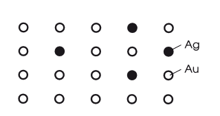 Атомная концентрация Au: Ag = 80: 20.Если атомы двух металлов мало отличаются по размерам (не более 13 %) и имеют одинаковые кристаллические решетки, то между ними образуются непрерывные твердые растворы. Это означает, что при любой концентрации компонентов структура сплава – твердый раствор. Пример такого взаимодействия – сплавы золота и серебра. Между этими двумя металлами существует неограниченная растворимость в твердом состоянии. Если атомы двух металлов значительно отличаются по размерам и металлы имеют разные кристаллические решетки, то они растворимы друг в друге ограниченно. Это значит, что твердый раствор существует только до определенной концентрации второго компонента. При увеличении концентрации выше растворимости образуется химическое соединение.