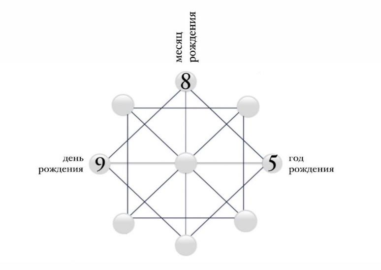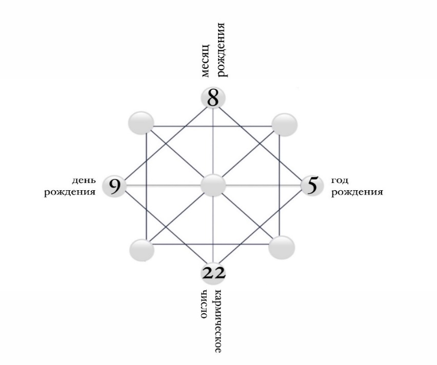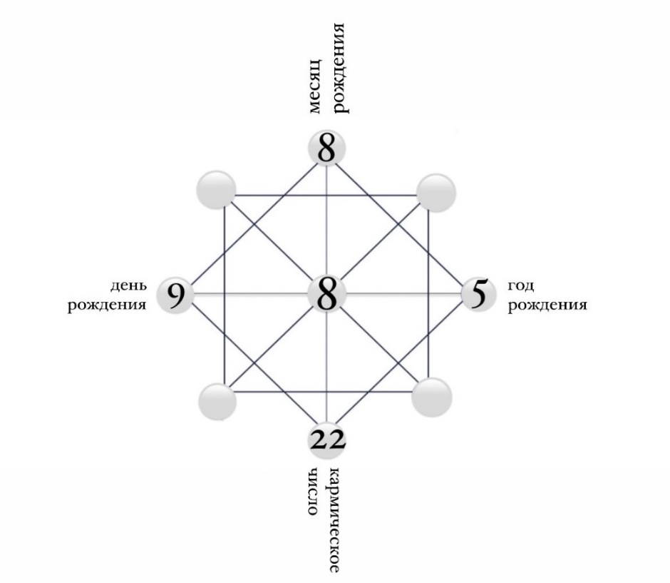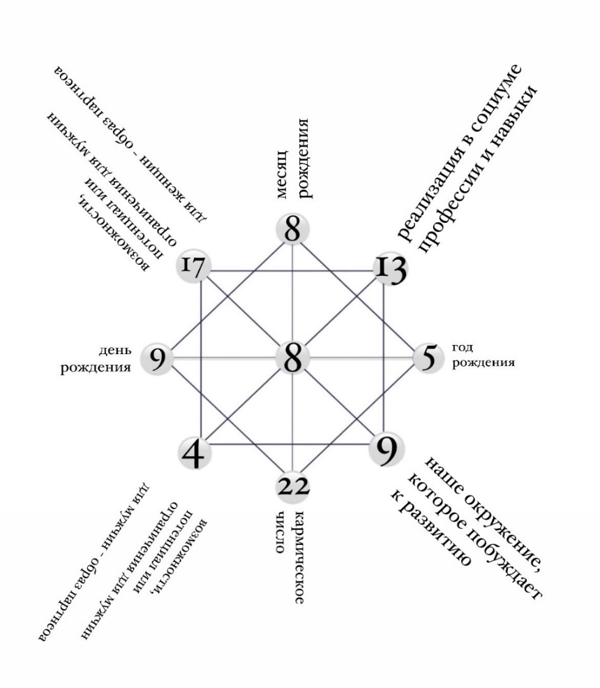 Как Вы наполняетесь и черпаете ресурс. Дает понимание того, к чему могут быть интересы. Как проявляетесь в общении. В каком состоянии свободно, уверенно, непринужденно. Как человек общается в социуме, социальные задачи. Позиция, отвечающая на вопрос: Кто Я? Характер человека, объединяет все сферы нашей жизни. Чтобы прийти к точке душевного комфорта, необходимо проработать низ матрицы, Кармическую задачу души на это воплощение. В точке душевного комфорта мы гармонизируем все сферы нашей жизни: семья, отношения, финансы, предназначение, таланты, здоровье и наше ресурсное состояние. Просчитывается путем сложения всех известных значений. 9+8+5+22=44=4+4=8