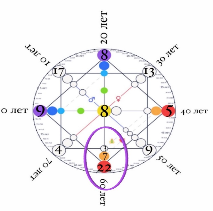 Нижние 3 энергии нашей матрицы. Считаем по алгоритму: Центр + Низ Матрицы= Пересечение линий – 8+22=30=3+0=3, затем считаем энергию между ними 22+3=25=2+5=7(оранжевый).