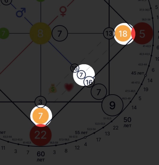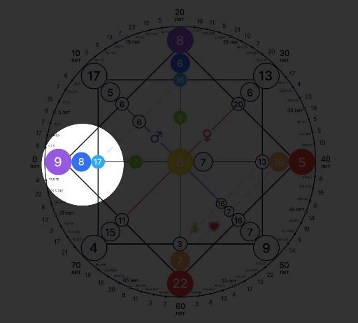 В верхних углах располагаются тройки цифр, отражающие информацию о духовных накоплениях соответствующего рода: отцовского или материнского. Эти программы принято называть Духовной кармой рода отца и Духовной кармой рода матери, соответственно.