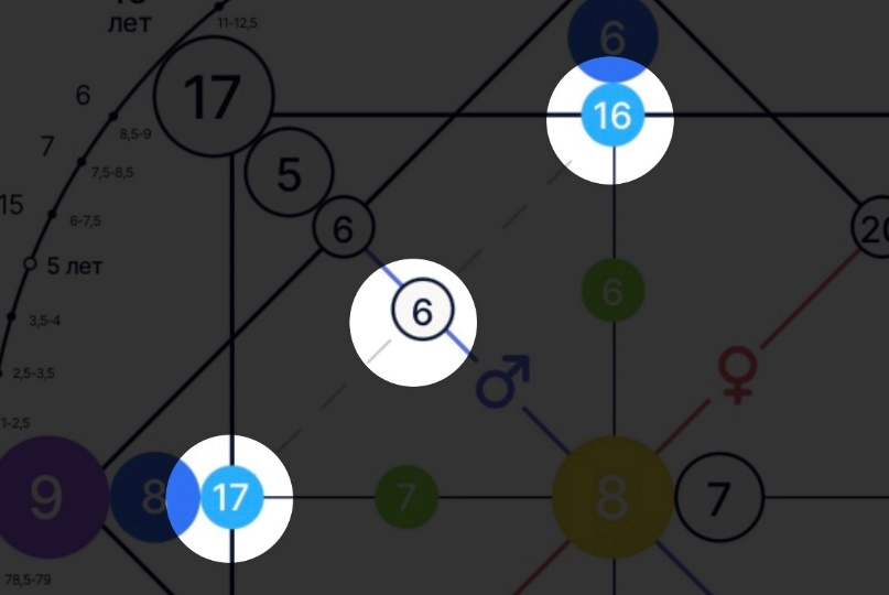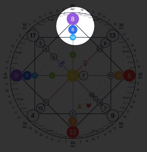 Энергии связи с Высшими силами. Фиолетовая позиция – Дар. Синяя позиция – таланты прошлого воплощения. Голубая позиция – талант самореализации. Цент Матрицы + Месяц Рождения= Пересечение Линий. 8+8=16, энергия между ними 16+8=24=2+4=6(синий)