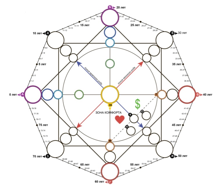 Энергия года рассчитывается аналогичным способом. Вся матрица разделена на периоды. После 80 лет – энергии повторяются. То есть энергия при рождении в 0 лет и в 80 лет будет одна и та же. В 1 год и 81 год – также, и так далее.