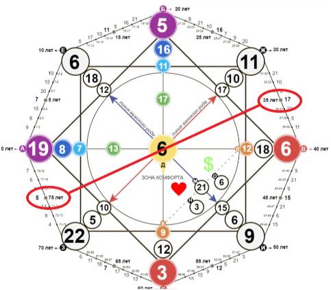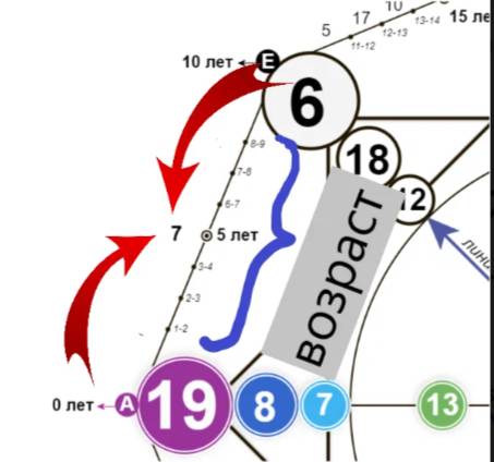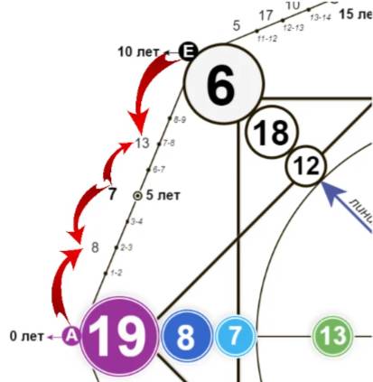 Значение в точке А (0 лет, момент рождения) имеет энергию дня рождения, т.е. это период, проходящий под 19 энергией в примере. Следующий известный нам аркан – это месяц рождения, он соответствует возрасту 20 лет. Чтобы найти энергию 10 лет – складываем два известных нам значения:
