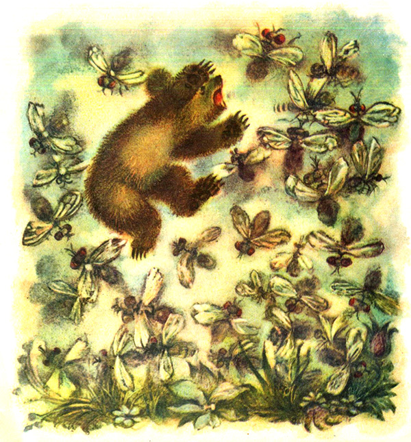 «А Мишка-Мухоед, — говорила Медведица, — самый что ни на есть дурашливый ребёнок». И правда, где это видано, чтоб медведь гонялся за мухами? А носился он за ними целые дни напролёт. Рявкнет на них, подскочит и валится наземь. Только неуклюжую лапу подвернул, как опять свалился — хвост-коротышку ушиб. Но ничего — опять гонится за мухой. Что ему только ни подсовывала мать в миску — и ягоды, и мёд, и мороженое, и вафли. Всё впустую: для Мухоеда ничего нет слаще мухи! Он и сам хвалился, и всякий раз всё охотней: