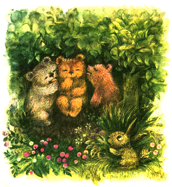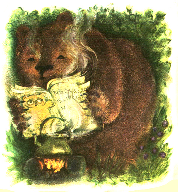 Так и жила счастливая медведица со своими медвежатами. Мишка-Медовик медовничал, Мишка-Ягодник ягодничал, Мишка-Мухоед муховничал. «Эти уже подросли, — стала подумывать медведица, — не завести ли малыша? Может, он будет Мишка-Охочий-до-Клёцек и станет клёцничать?»