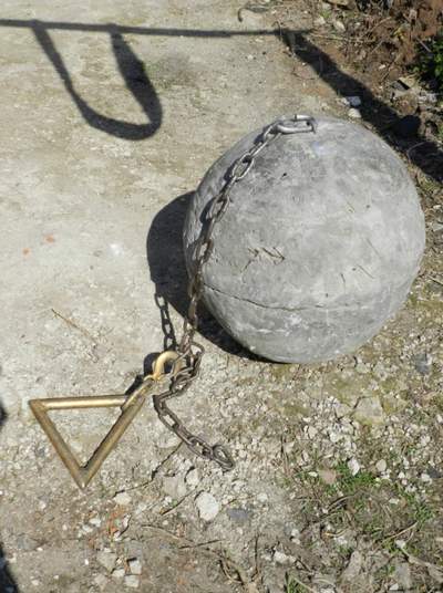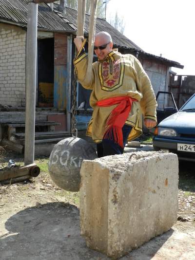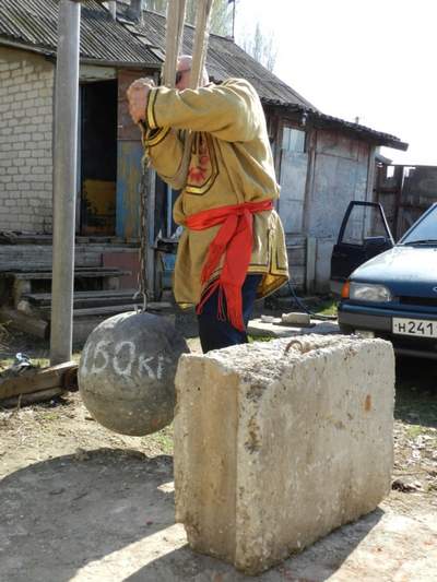 заданным количеством повторений перемещаем отягощение свободного веса, в данном случае, бетонный шар общим весом 150 килограмма (см. фото № 1) усилием мышц правого бицепса в направлении от нижней точки амплитуды движения отягощения Аст (см. фото № 4 к ее верхней точке (см. фото № 5), путем взрывного мышечного ускорения за время, равное одной секунде (1с).