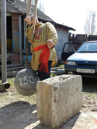 заданным количеством повторений перемещаем отягощение свободного веса, в данном случае, бетонный шар общим весом 150 килограмм (см. фото № 1) усилием мышц правого бицепса в направлении от