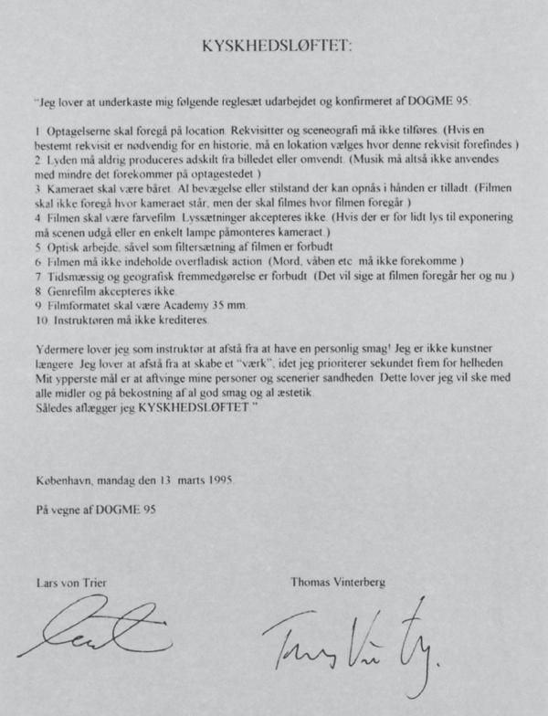 Так можно ли считать это коллективным творчеством? Обет целомудрия, напечатанный на обороте красного манифеста. Триер запустил волну «Догмы» в 1995 году в Париже. Многие из правил он написал еще до встречи с Томасом Винтенбергом. И, конечно, никто никогда не сомневался в том, кто в «Догме» самый равный среди равных.