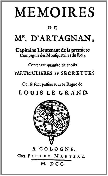Фронтиспис из изд.: M'emoires de M. d’Artagnan, capitaine lieutenant de la premi`ere Compagnie des Mousquetaires du Roi, contenant quantit'e de choses particuli`eres et secrettes qui se sont pass'ees sous le R`egne de Louis le Grand: En 3 vol. Amsterdam: chez Pierre Rouge, 1704. Tome premier.