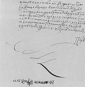 Надпись Петра I и А. Д. Меншикова в альбоме Ф. Рюйша. 17 сентября 1697 г.Первая известная подпись Меншикова: «Александръ Меньшикофъ».
