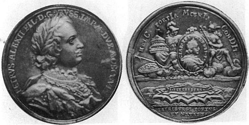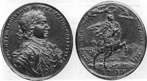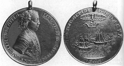Медаль в память взятия двух шведских судов в устье Невы 7 мая 1703 г. Работа Ф. Алексеева. 1703 г.На лицевой стороне: погрудное изображение Петра в доспехах и