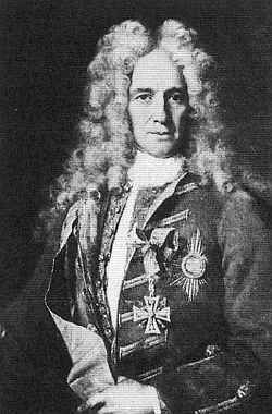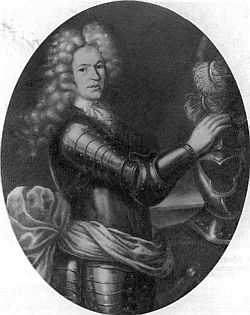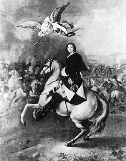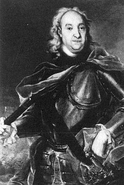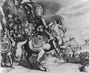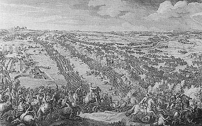 А. Д. Меншиков на фоне сражения при Калише. Гравюра П. Пикарта. 1707 г.