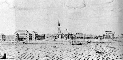 Вид на реку Неву с Кадетским корпусом (бывшим домом Меншикова). Гравюра Я. В. Васильева. 1753 г.На переднем плане – первый мост через Неву в Петербурге, построенный от церкви Исаакия Далматинского ко дворцу А. Д. Меншикова.