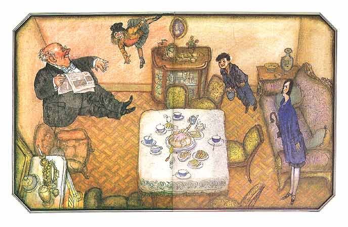 — А теперь можно и чаю попить, — продолжал, как бы не слыша, мистер Кудри. И вдруг огорчённо заморгал. — Боже мой! — воскликнул он. — Как ужасно! Я только сейчас сообразил — стол-то внизу, а мы здесь, под потолком. Что же теперь делать? Мы здесь — он там. Трагедия! Ужасная трагедия! Можно умереть со смеху! — Он прикрыл лицо носовым платком и громко расхохотался.