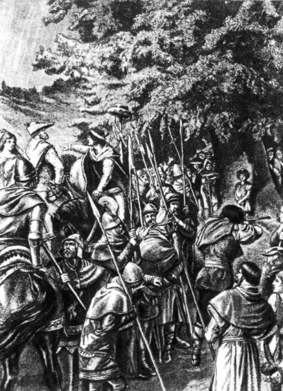Вильгельм Телль, слывший в народе искуснейшим охотником и стрелком, прошел мимо столба, даже не взглянув на шляпу. Австрийские рейтары схватили Телля и привели его к наместнику.