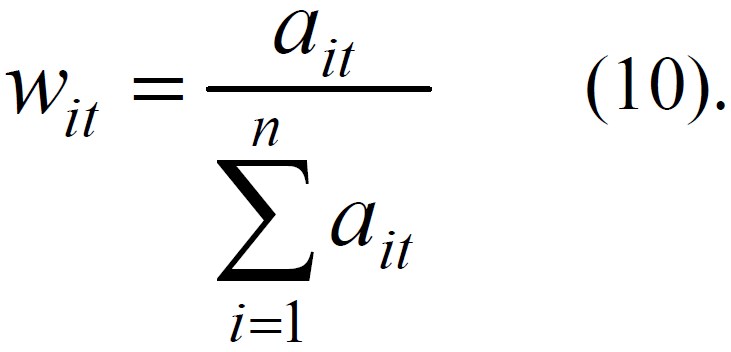 Теперь посмотрим, как работает ресурс, направляемый индивидом в политику. Целью такого инвестирования, напомним, является перемещение селектора . Ресурсы, инвестированные в политику, определяют политический вес каждого актора. Политические веса определяют положение селектора st в направлении индивидуальной точки xi, сокращение расстояния it для увеличения распределяемой актору доли общего ресурса. Политическую борьбу при таком подходе можно представить как «перетягивание» селектора: каждый инвестирующий в политику актор пытается сдвинуть правило отбора в свою сторону. К такому «перетягиванию» каждый актор прикладывает разную «силу», которую мы назовем индивидуальным политическим весом и обозначим wit. Эта величина обладает теми же свойствами, что и индивидуальная доля в общем ресурсе it (5): принимает значения на интервале от нуля до единицы, сумма индивидуальных политических весов равна 1.