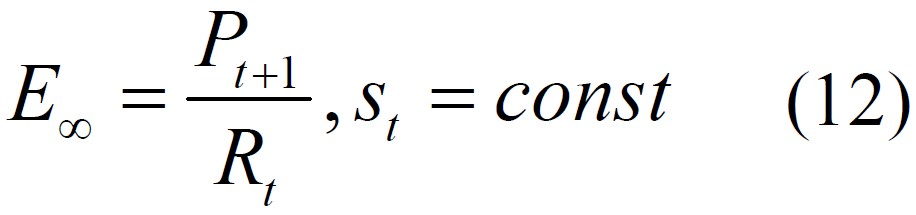 Теперь рассмотрим некоторые общие свойства динамики модели через призму системной эффективности; последняя, напомним, представляет собой отношение «завтрашнего» совокупного продукта к «сегодняшнему» общему ресурсу (1). Отметим, что как только селектор st перестает меняться во времени (достигает равновесного состояния s 30 ), отношение