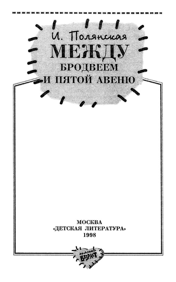 Annotation Художник Г. Бирюков Полянская И. Н. Между Бродвеем и Пятой авеню: Повести и рассказы. — М.: Дет. лит., 1998. — 315 с.: ил. — (Опасный возраст).