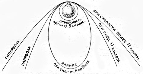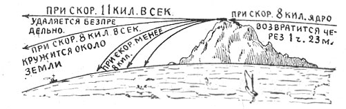 Ради простоты, мы начали с рассмотрения горизонтально брошенного тела. В небесной механике доказывается, однако, что те же выводы справедливы и для тела, брошенного под углом к горизонту или даже вертикально, как ядро в романе Жюля Верна. Во всех случаях, при достаточной скорости, брошенное тело навсегда покидает Землю и уносится в пустыни мирового пространства.