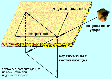 При этом необходимо учесть, что величина смещения полюсов заведомо меньше величины максимального смещения земной коры. Это понятно из Рис. 5 на стр. 16 : касательная составляющая силового воздействия при ударе метеорита о земную поверхность может быть разложена на меридиональную и широтную составляющую. Довольно очевидно, что перемещение полюсов происходит лишь под воздействием меридиональной (перпендикулярно экватору) составляющей. Однако при "благоприятных условиях", т.е. при соответствующей траектории падающего метеорита, величина меридиональной составляющей не сильно отличается от всей касательной составляющей.