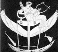 Аполлон с луком и колчаном за спиной настраивает лиру, путешествуя по морю на пророческом треножнике, который изображен здесь с крыгльями (роспись на сосуде)