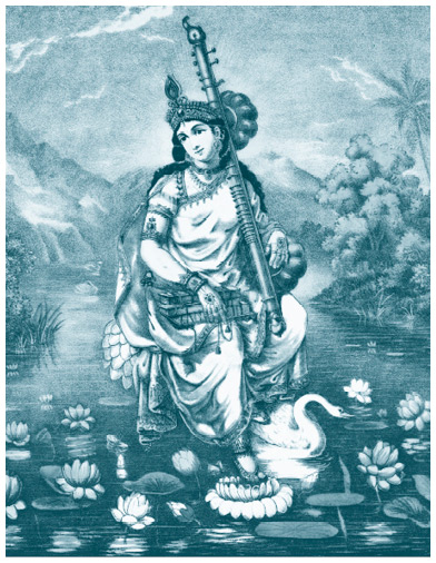 Сарасвати как богиня — женское дополнение Брахмы, творца вселенной, а еще это наиболее почитаемая река в «Ригведе», благодатная, полноводная и стремительная, наделенная множеством свойств (защитных, очистительных, целительных) и отождествленная с богиней речи Вач. В послеведийский период она становится богиней мудрости и красноречия, изобретательницей санскрита и деванагари, покровительницей искусств и наук. В триаде главных богинь индуизма (вместе с Лакшми и Шакти) она воплощает знание, в то время как две другие высшие сущности — богатство и силу.