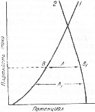 При сопротивлении же элемента не бесконечно малом, а равном какой-то определенной величине R, сила тока будет выражаться ординатами точек В и B1на обеих кривых, расстояние между которыми – отрезок А – равно падению напряжения на омическом сопротивлении (К). Поскольку катодный и анодный процессы взаимно связаны. – Т.е. их скорости равны, то точки В и B1на катодной и анодной кривых должны иметь одинаковые ординаты. Чем больше омическое сопротивление между катодными и анодными участками, тем больше будет величина отрезка А1между катодной и анодной кривыми. – Т.е. тем меньше будет сила тока, или, иначе говоря, скорость процесса.