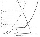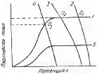 амальгамы. Из рисунка видно, что скорость цементации более электроотрицательного металла А меньше скорости цементации металла Б, более электроположительного. Соотношение скоростей выражается соотношением ординат точек О1 и О2. Если же более электроположительный металл присутствует в малых количествах и ход его поляризационной кривой таков, как на кривой4, то и в этом случае скорость цементации более электроположительного металла оказывается меньше, чем скорость цементации более электроотрицательного металла, присутствующего в Больших количествах. Если же оба металла присутствуют в одном и том же растворе, то при малых концентрациях этих металлов поляризационная кривая (кривая 1, рис. 5) будет иметь вид обычной полярографической кривой для двух металлов.Рисунок 4. Цементация двух металлов из двух раздельных растворов