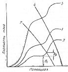 На рисунке 2 схематически показаны поляризационные кривые для катодного выделения металла (кривая 1) и для анодного окисления амальгам двух металлов, обладающих различными потенциалами (кривые 2 и 3). Ход этих кривых определяется природой металлов, природой электролитов и зависит также от ряда других факторов, в частности от температуры, скорости перемешивания, концентрации металла в амальгаме и концентрации ионов металла в растворе. Из рисунка 2 видно, что скорость цементации при данном ходе поляризационных кривых будет выше при цементации амальгамой более электроотрицательного металла. Соотношение скоростей будет выражаться соотношением ординат точек О1 и О2. Однако по мере цементации концентрация ионов цементируемого металла в растворе будет уменьшаться, и это можт вызвать изменение хода поляризационной кривой. При малой концентрации может наступить явление так называемого предельного тока, и поляризационная кривая примет вид, показанный на рисунке 3 (кривая 1). Как видно из рисунка, в этом случае скорость цементации становится уже не зависящей от природы выбранных нами цементирующих металлов. Однако если взять третий металл (кривая 2), более положительный, нежели два предыдущих, то при данной концентрации ионов цементируемого металла для него скорость цементации будет меньше, чем для двух предыдущих металлов (сравните ординаты точек О1, О2 и О3). При дальнейшем уменьшении концентрации цементируемого металла скорость станет равной для всех трех металлов (кривая 5).