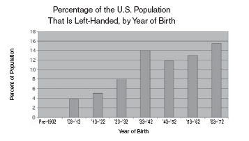 Но у современных поколений дело обстоит по-другому. Стало очевидно, что насильственное переучивание и болезненно, и не обязательно, поэтому сегодня у детей неожиданно стали уважать то, чего раньше не терпели.. Только взгляните на перемены, происходящие сегодня в Америке. Согласно исследованию 1993 года, проведенному Калифорнийским университетом в Лос-Анджелесе, процент левшей, родившихся в 1960-х годах, вдвое превысил число леворуких у американцев шестидесятилетнего возраста и старше.