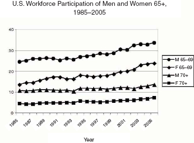 Однако — что касается последней цифры — так ли хотят американцы уходить на пенсию? Теперь, когда столь многие в Америке благополучно доживают до 85 лет, все меньше и меньше их в действительности уходят на пенсию в 65. Сегодня в США насчитывается более 5 миллионов человек старше 65 — почти вдвое больше, чем в начале 1980-х годов. И эта цифра готова многократно увеличиться.