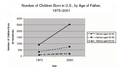 В 1980 году в Америке только 1 из 23 новорожденных принадлежал мужчинам 50 лет или старше. В 2002-м это соотношение возросло до 1 к 18. В тоже время уровень рождаемости у отцов в возрасте 40—44 лет поднялся на 32 процента, а у отцов в возрасте 45—49 лет — на 21 процент. У отцов в возрасте