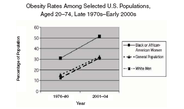 Однако в реальной жизни несоразмерный вес означает следующее. В Америке насчитывается чуть более 18 миллионов чернокожих женщин. Если на каждую шестую приходится одна с патологическим ожирением, это значит, что более 3 миллионов афроамериканок несут на себе 45 и более килограммов лишнего веса. Согласно исследованиям 2006 года Американской медицинской ассоциации, люди с патологическим ожирением относятся, как правило, к возрастной группе 50—59 лет. Иначе говоря, самые грузные темнокожие женщины находятся в расцвете трудоспособного возраста или способны с полной отдачей ухаживать за внуками. Это отнюдь не худшие новости. Согласно исследованиям той же Американской медицинской ассоциации, которая изучала проблему в течение 7 лет, риск преждевременной смерти у женщин с патологическим ожирением в 2 раза выше, чем у женщин, имеющих нормальный вес. Такая статистика ставит афроамериканок среднего возраста в группу повышенной смертности.