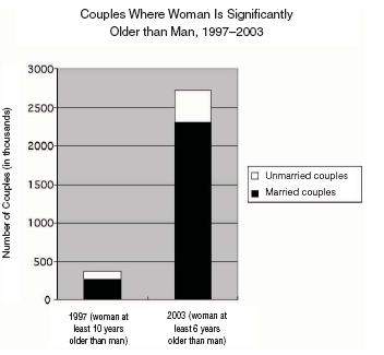 Хотя, по данным Бюро переписи населения США, число таких пар в период с 1997 по 2003 год было различным, рост очевиден. В 1997-м в Америке было менее полумиллиона пар с возрастной разницей между женщиной и мужчиной в десять лет и больше. В 2003-м количество пар с возрастной разницей по крайней мере в шесть лет составляло уже 3 миллиона.