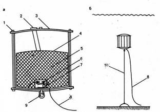 1 – железный каркас; 2 – трубка для засыпки пороха; 3 наружный медный корпус; 4 – внутренний медный корпус; 5 – пороховой заряд; 6 – угольковый запал; 7 – шариковый замыкатель; 8 – электропроводник к береговой батарее; 9 – рым для минрепа; 10 – минреп