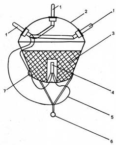 1 – гальваноударные свинцовые колпаки: 2 – железный корпус; 3 – пироксилиновый заряд: 4 – запальное устройство; 5 – соединительные проводники запала; 6 – рым для минрепа; 7 – соляной разъединитель цепи запала