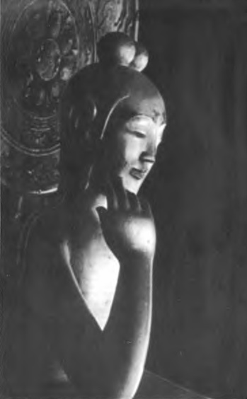 Голова и торс «Будды будущего» (Бодхисаттва Майтрея). Эта статуя с мягкими очертаниями, высотой 4 фута 3 дюйма, вырезана из дерева около 650 г. до н. э. и принадлежит Тюгудзи, храму в Нара. В этой фигуре, получившей известность среди ранних японских скульптур из-за своего благородства, ощутимой мягкости облика и жестов, можно увидеть следы влияния буддийской философии, распространявшейся по странам Азии. Плавные, округлые линии торса напоминают о золотом веке индийской династии Гуптов, а прозрачные волны драпировки, которые здесь не видны, связаны с последним периодом китайской династии Вэй.