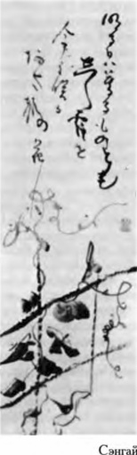 На этом рисунке цветущая ипомея обвивает бамбуковую изгородь. Стихотворение из тридцати одного слога, или танка, прославляет этот любимый цветок японских поэтов, который распускается на рассвете и увядает уже к закату. Существует множество переводов сопровождающего рисунок стихотворения. Данный перевод сделан на основе перевода Д. Т. Судзуки — кажется, он точнее всего передает его подлинное значение.