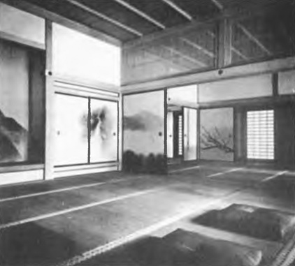 Внутренний вид с южной стороны сёин (столовой), второй комнаты образца традиционного японского дома. Дом изготовили в Нагоя в 1953 г., а потом, разобрав на семьсот деталей, доставили в Америку и заново собрали в саду Музея современного искусства в Нью-Йорке в доказательство «удивительного соответствия» традиционной японской архитектуры современному западному стилю. Дом представляет собой типичное жилище аристократа XVI–XVII вв. Его суровая простота и намеренная пустота поразительны. В сегодняшней Японии дома такого типа примыкают к храму и служат жилищем для священника.