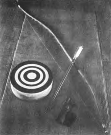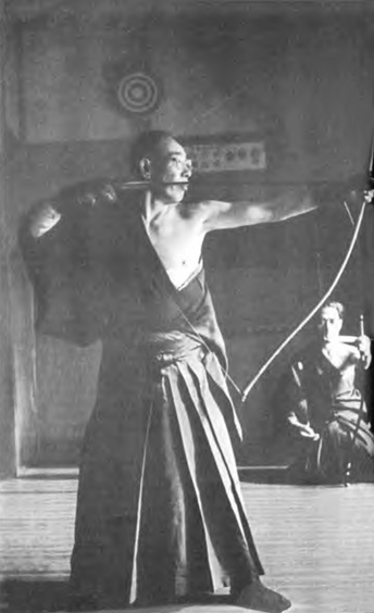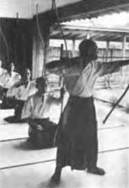 Искусство стрельбы из лука практикуется в Японии не только для совершенствования в меткости или победы в состязаниях. Прежде всего это средство для достижения самоотречения и стремления к тому, чтобы «лук, стрела, цель и я» стали единым целым. Одни стрелки, одетые в черные костюмы, участвуют в церемониальном состязании, а другие тренируются.