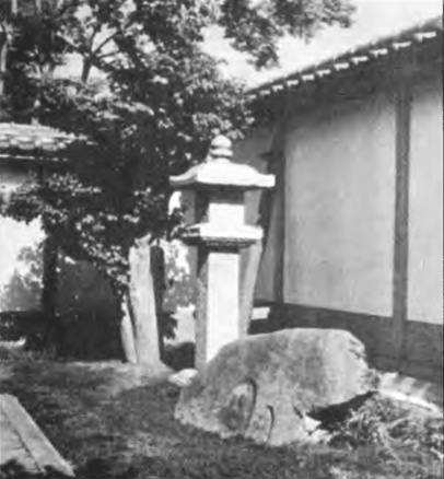 Уголок сада в Рёсэнан, украшенный камелией, каменным фонарем и камнем с резьбой.