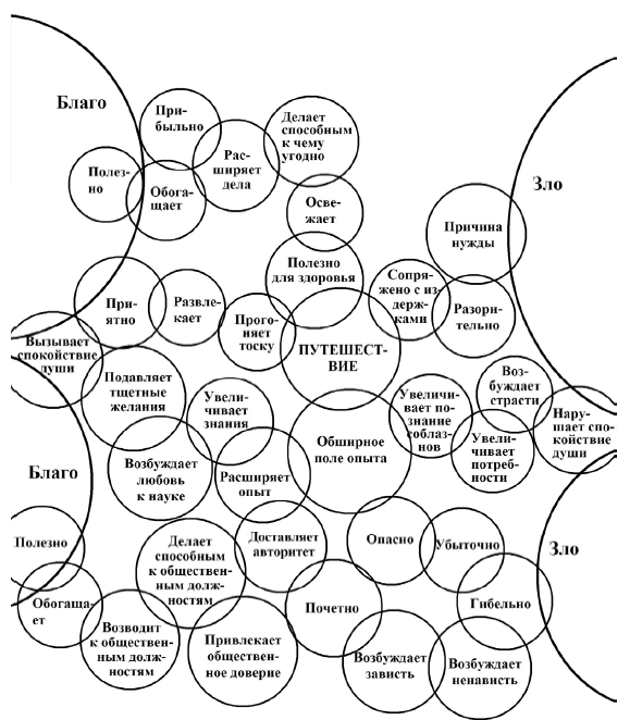 Я не хотел бы только, чтобы из-за схемы этому маленькому и побочному исследованию придали больше значения, чем оно заслуживает по своему характеру. Пояснительным примером я избрал понятие путешествия. Его сфера захватывает область четырех других, и к каждой из них оратор может переходить произвольно; эти сферы, в свою очередь, захватывают другие, – иной раз даже одновременно две или больше; оратор произвольно выбирает в них свою дорогу, всегда делая вид, будто она единственная, а затем смотря по своей цели в конце концов достигает блага или зла. Надо только при прохождении сфер всегда идти от центра (данного главного понятия) к периферии, а не обратно. Оболочкой такой софистики может быть или плавная речь, или же строгая силлогистическая форма – смотря по тому, где находится слабая струнка слушателя. В сущности, большинство научных, особенно философских доказательств построены немногим лучше: иначе как было бы возможно, чтобы столь многое и в разные времена не только ошибочно принималось за истину (ибо ошибка сама по себе имеет другой источник), но и проходило через точную аргументацию и доказательство, а впоследствии оказывалось совершенно ложным? Таковы, например, лейбнице-вольфовская философия, птолемеевская астрономия, химия Сталя, ньютоново учение о цветах и так далее.