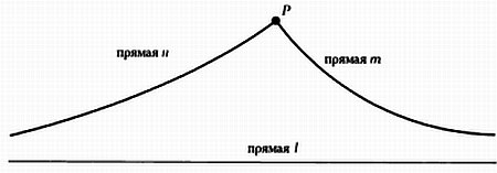 На следующем рисунке показано, как в гиперболической геометрии выглядит предыдущий рисунок. Теперь прямые линии тип изображены в виде кривых не потому, что они действительно такие, а для того чтобы не возникло путаницы с евклидовой ситуацией. На таком рисунке хорошо видно, что представляют собой асимптотические прямые шип.