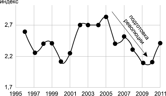 В преддверии революций показатели индекса в соответствующих странах начинают падать, то есть в представлении населения масштабы коррупции в государстве возрастают. Это указывает на то, что общество целенаправленно разогревается в ожидании времени Ч.