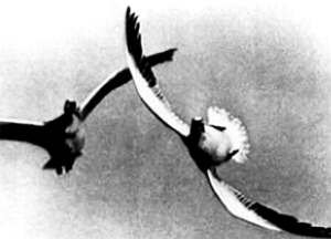 Редчайший снимок… Дикий гусь приготовился спикировать в воду. Ему удобней пикировать, перевернувшись кверху ногами. Но не только в этом суть любопытного. Посмотрите, как держит гусь голову. Голова — «не кверху ногами»!