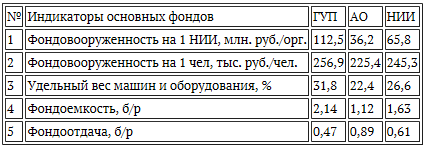 В [24] опубликованы результаты анализа основных фондов за 2001 г. (таблица 1). Информация обрабатывалась в трех сечениях: для всей выборки научных организаций государственной и акционерной форм собственности (НИИ); только для государственных унитарных предприятий (ГУП); только для акционерных организаций (АО).
