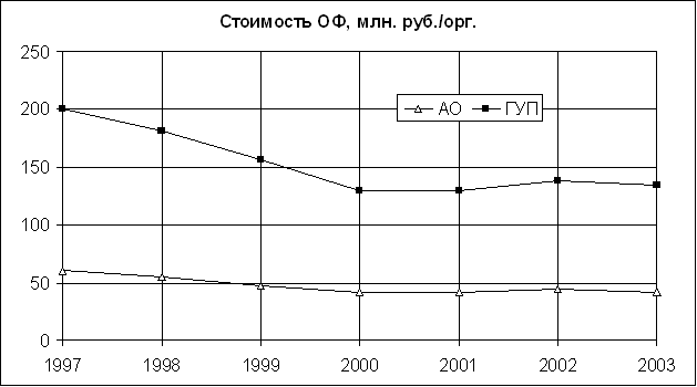 что обеспечивает высокий уровень репрезентативности и объективности. Исследования проведены на примере ведущих отраслевых НИИ химической и нефтехимической промышленности государственной и акционерной форм собственности (83 организации) [35, 404]. Государственный сектор представляют 26 государственных унитарных предприятий (ГУП). Под акционерными организациями (АО) объединены НИИ как со смешанной, так и с частной формой собственности [405].В результате анализа показано (см. рисунок 32), что средние объемы основных фондов для ГУП варьировались с 1997 года по 2003 от 200 до 130 млн. руб. на одну научную организацию. Для АО эти изменения менее выражены – от 60 до 40 млн. руб. на одно АО и размах вариации составляет только 20 млн. руб. (для ГУП – 70 млн. руб.). Как видно (см. рисунок 32), все эти годы объем основных фондов в государственных НИИ в 3-3,5 раза выше, чем в акционерных.