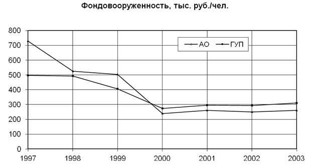 Такие важные показатели как фондоемкость и фондоотдача за 2001 г. в акционерных организациях почти в 2 раза лучше, чем в государственных (см. таблицу 1). Однако если при расчете этих показателей вместо общих объемов выполненных работ использовать только объемы научно-исследовательских работ, то значения фондоемкости и фондоотдачи для ГУП и АО будут практически одинаковыми [24].